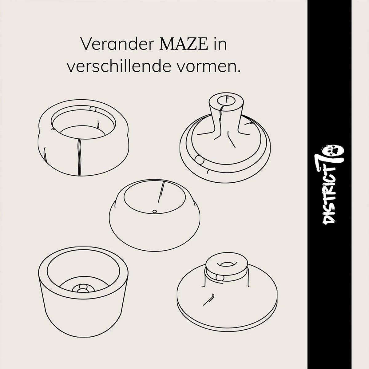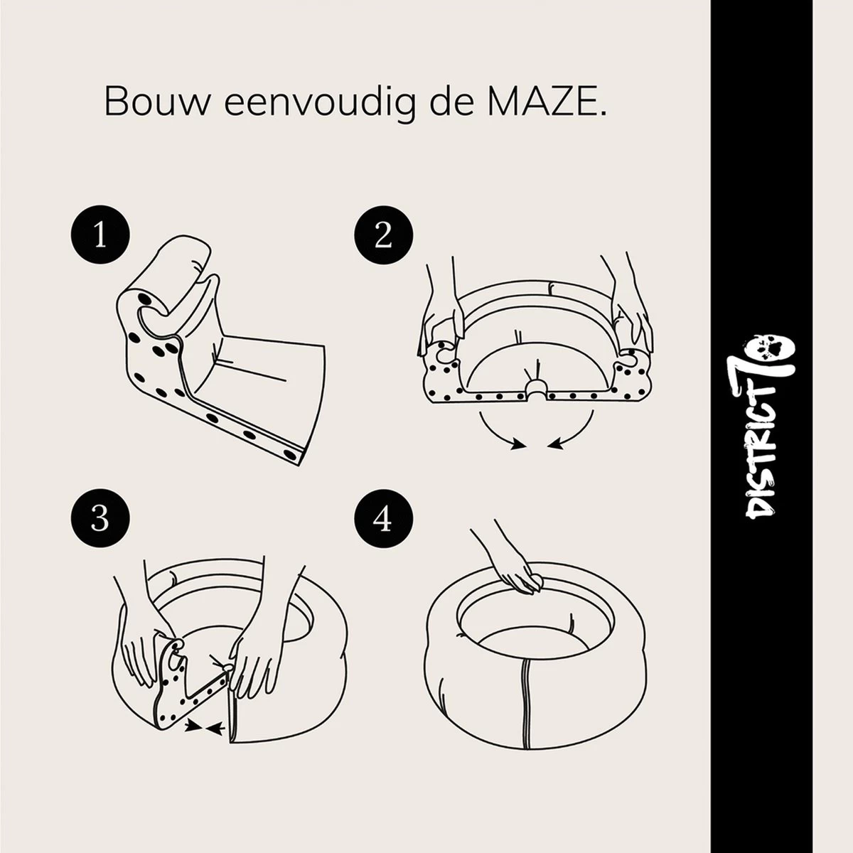 De MAZE van District 70 is eenvoudig in elkaar te zetten door de twee zijdes met klittenband aan elkaar te bevestigen. Als je dit voor de eerste keer doet, dan is het materiaal wat stevig. Rek de MAZE eerst goed uit en vouw hem dan in de vorm die je wenst. Wanneer je de kartonnen kattenmand wilt opbergen dan kan je hem weer eenvoudig in elkaar vouwen.