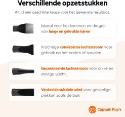 Deze waterblazer is ideaal voor het onderhoud van honden. Doet hetzelfde als borstelen, maar zonder de huid en vacht te beschadigen. Blaast stof en vuil uit de vacht en voorkomt hiermee dus klitten! Maar is ook een superdroger na een bad of een regenbui. De ronde tuit is voor honden zoals Newfoundlanders en Golden Retrievers. De brede platte tuit voor honden die het wat enger vinden. Voor honden met vachten zoals Doodles en Poedels de smallere tuit om met meer kracht te kunnen drogen.