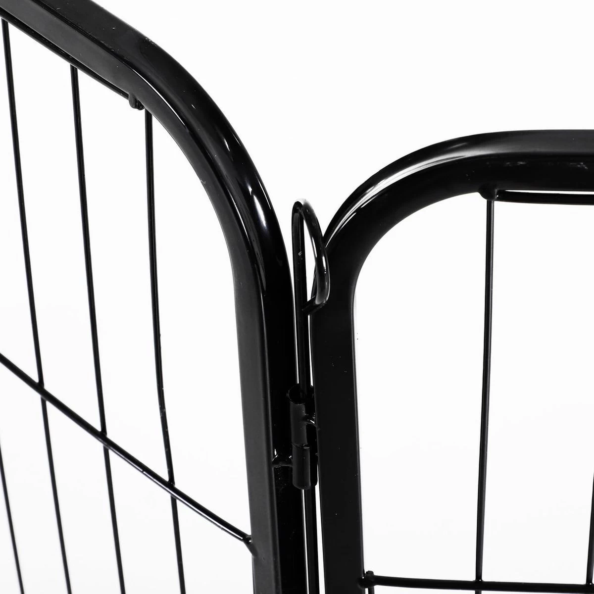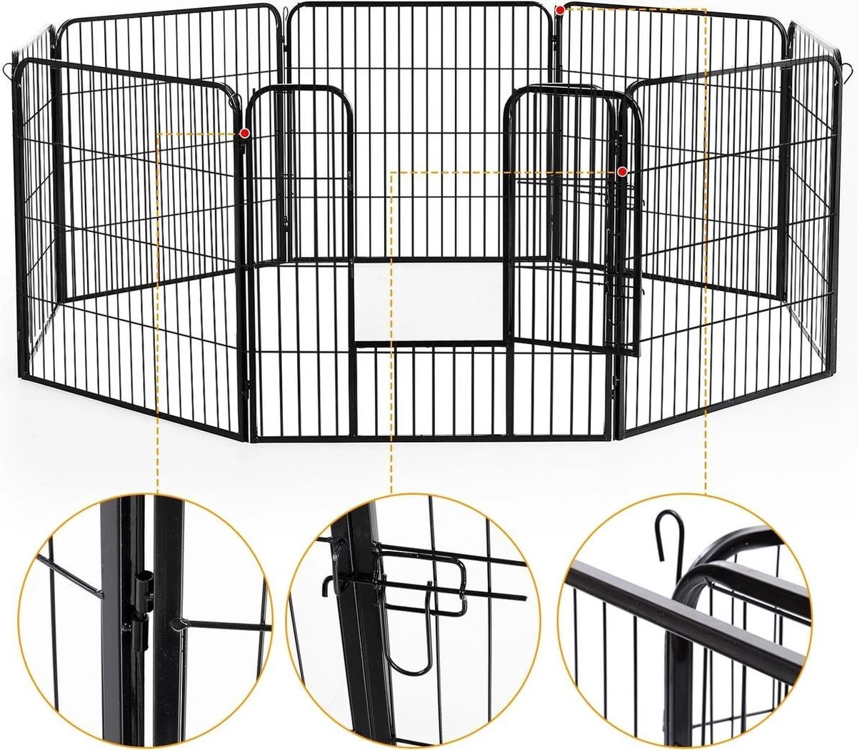 Een 8-tal ankerhaken zijn inbegrepen voor veilige bevestiging in de grond. Een hekdeel is voorzien van een afsluitbare deur. Honden en puppy’s hebben zo eenvoudig toegang tot de ren. Deze puppyren kan ook eenvoudig en flexibel worden opgezet. De afzonderlijke elementen kunnen worden gedemonteerd wanneer ze niet worden gebruikt of wanneer het weer plotseling verandert en kunnen worden opgeborgen om ruimte te besparen. Met een extra set van dezelfde grootte kun je deze hondenren desgewenst uitbreiden.
