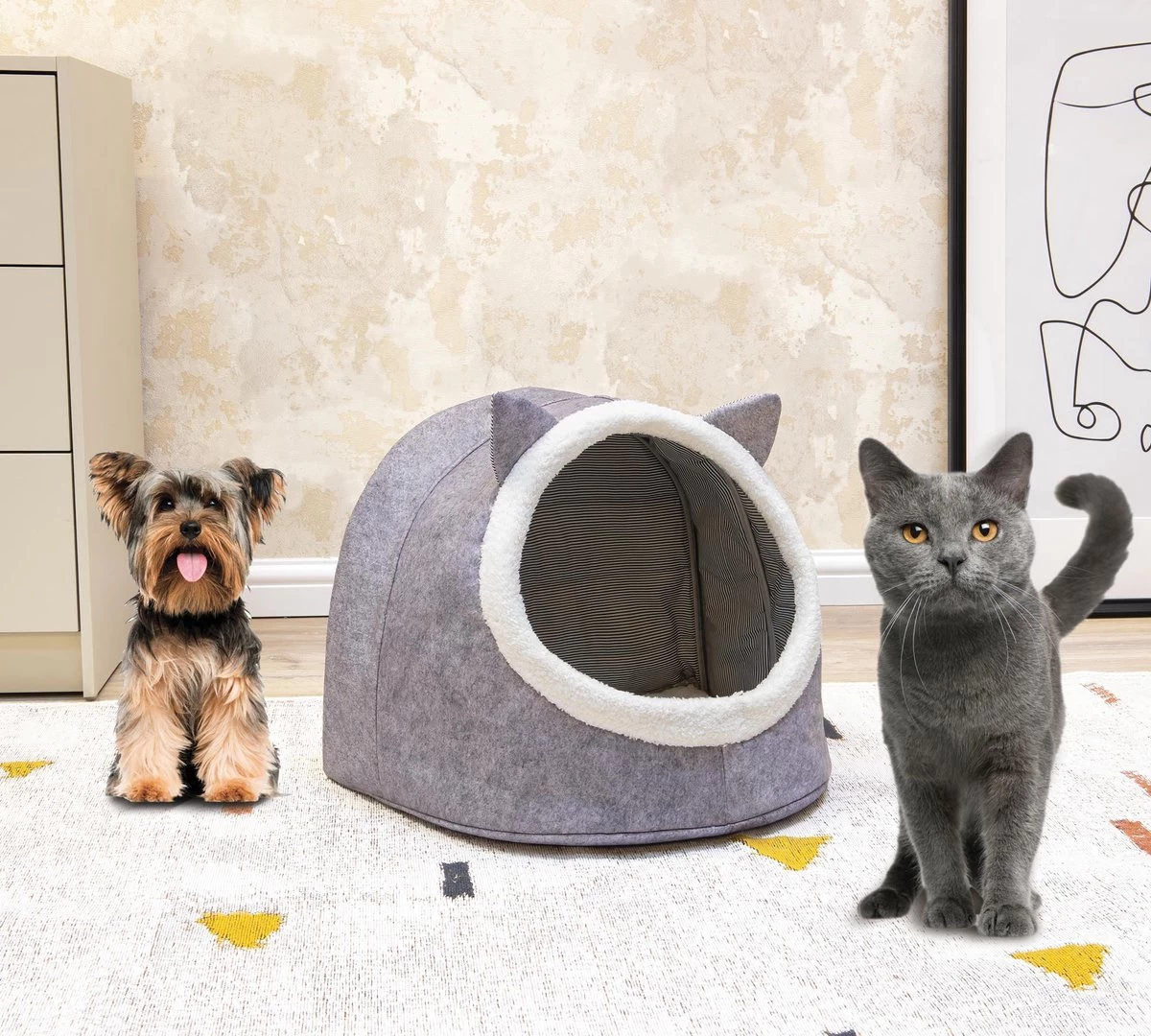 Het buitenste deel van de huizen is gemaakt van hoogwaardig vilt, dat er niet alleen mooi uitziet, maar ook duurzaam en duurzaam is. Het binnenste gedeelte is gevoerd met zachte wollen stof en biedt een warme en comfortabele ruimte voor uw huisdieren om lekker in weg te kruipen. Geen koude nachten meer voor uw geliefde vachtbaby’s!