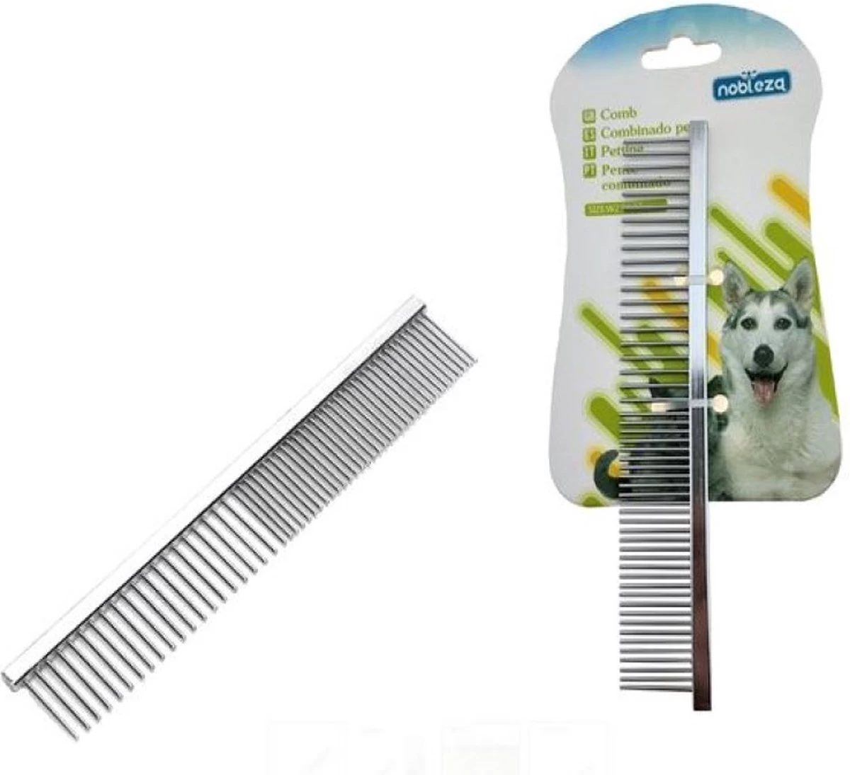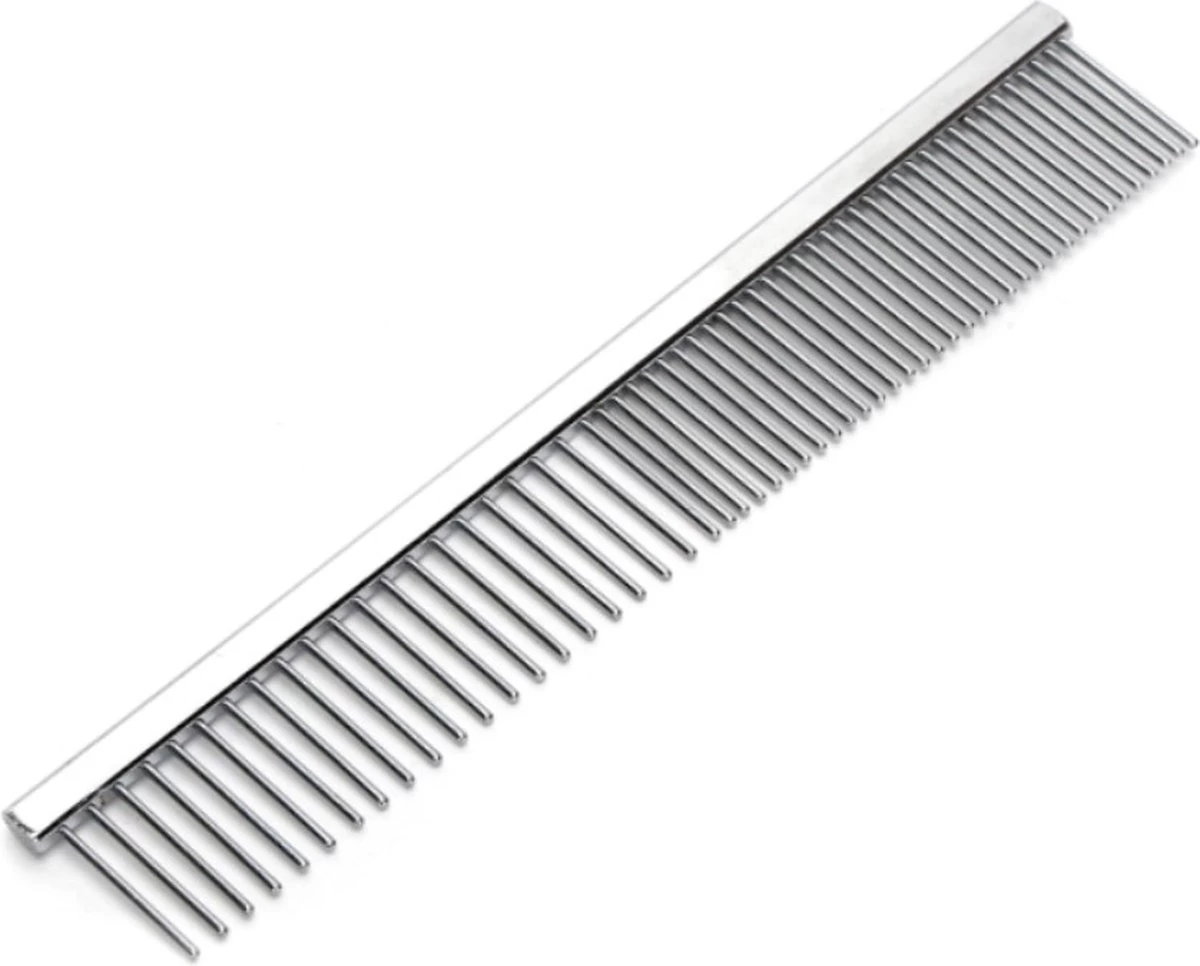 Goede kwaliteit kam voor honden en katten met twee verschillende afstanden tussen de pinnen. De toppen van de pinnen zijn afgerond waardoor je de huid van de hond niet kan beschadigen. Doordat deze kam antistatisch is vergemakkelijkt dat het kammen van een vacht.