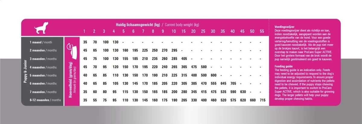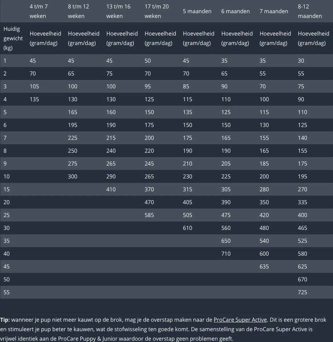 Wanneer je pup te groot wordt en niet meer kauwt op de brok, kun je de overstap maken naar de ProCare super. Deze voeding heeft een vrijwel identieke samenstelling als de ProCare puppy & junior, met als verschil een grotere brok waardoor de hond gestimuleerd wordt te kauwen. Dit bevordert de vertering en opname van voedingsstoffen.