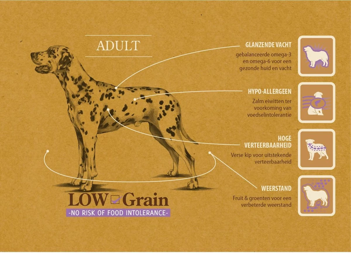 | Analytische bestandsdelen | HYPO-ALLERGEEN ZALM GROENTEN & FRUIT HYPOALLERGENE RECEPTUUR – ZALM EN AARDAPPELEN VOOR VOLWASSEN HONDEN VAN ALLE RASSEN GLANZENDEVACHT Evenwichtige Omega-3 en Omega-6 voor gezonde vacht en huid HYPO-ALLERGEEN ZALM Zalm eiwitten voor de preventie van voedselintolerantie HOGE VERTEERBAARHEID Zalm voor een uitstekende verteerbaarheid IMMUNITEIT Groenten & fruit voor verbetering van immuniteit ZALM & AARDAPPEL VOLWASSEN SPECIAAL GESCHIKT VOOR HYPO- ALLERGENE VOEDING-OF RASSEN MET SPECIALE VOEDINGSEISEN |