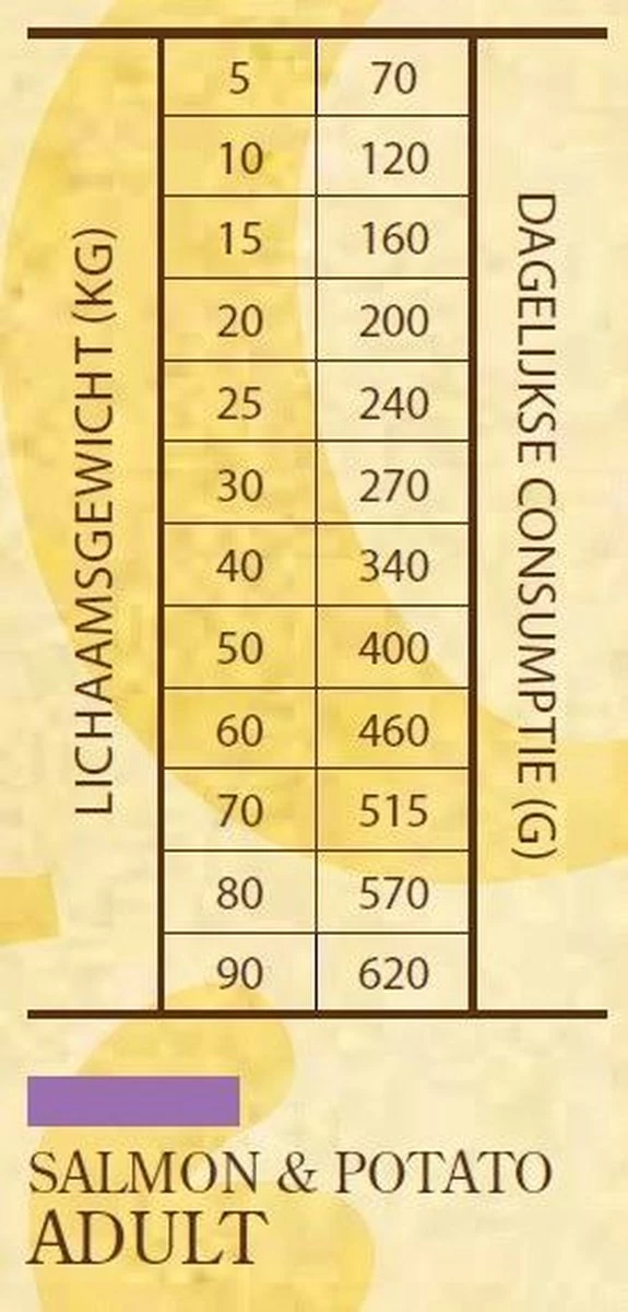 | Voedingswaarde | : 13 kg. Smaak: Zalm&Aardappel. Zalm, aardappel, mais, gevogeltevet (geconserveerd met gemengde tocoferolen, een bron van vitamine E) zalm olie, natuurlijke smaakstoffen, gedroogde appels, biergist, tomaten, yucca schidigera extract, wortelen, mineralen, DLmethionine, l-lysine, mannan-oligosachariden, fructo-oligosachariden, probiotica. |