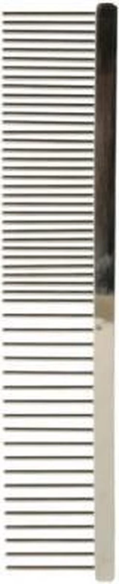 Deze metalen kam is ideaal voor het losser maken van de vacht en deze ontklitten. De kam heeft een middelwijde/wijde vertanding. Daarnaast is de kam ook geschikt voor alle vachttypes. Deze kam is gemaakt van metaal.