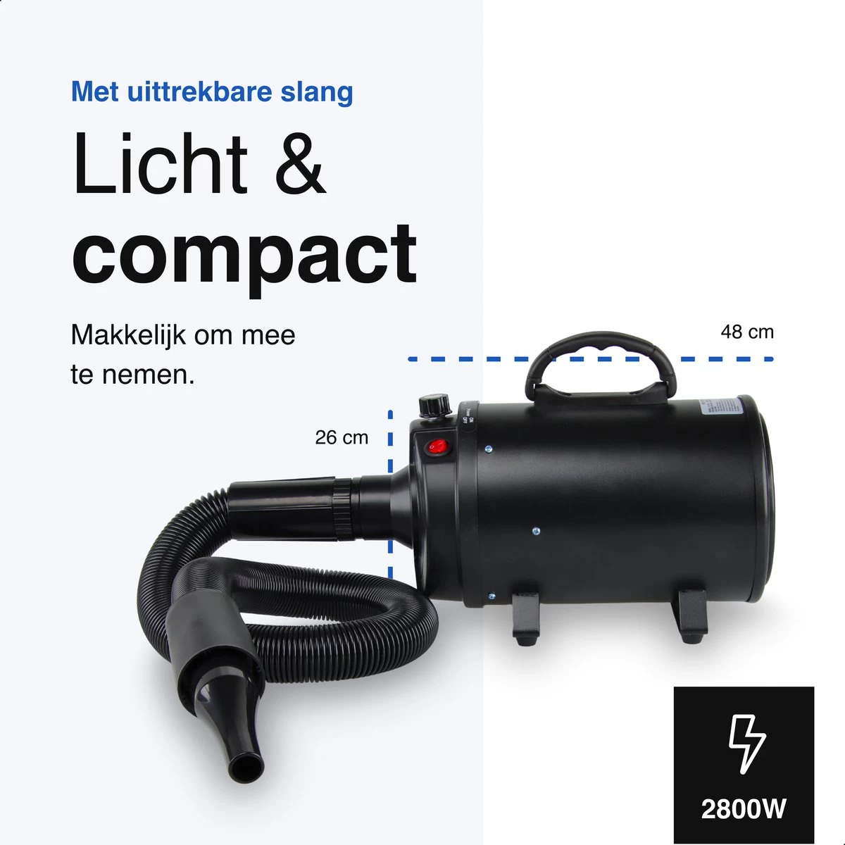 De waterblazer is met 2800W super krachtig. De blaaskracht van de hondenföhn waterblazer is instelbaar van 20 – 70 m/s en is de warmte instelbaar van 30 tot 50 graden Celsius. Je hond is in maximaal 20 minuten weer helemaal schoon en droog. Natuurlijk is dit niet alleen afhankelijk van de blaaskracht en de warmte, maar ook de grootte van je hond speelt een belangrijke rol.